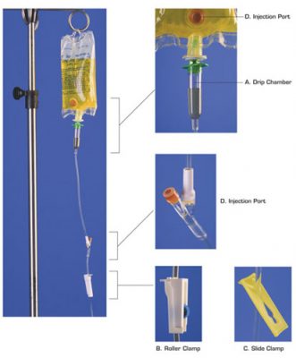 ه. پورت(درگاه) تزریق جایی است که دارو یا مایعات (غیر از موارد موجود در کیسه سِرم فعلی) می تواند تزریق شود تا به وسیله لوله ها به ورید بیمار رسانده شود. در تصویر بالا می توانیم 2 پورت را ببینیم: یکی روی خود کیسه و یکی زیر محفظه سرم. معمولا یک پورت تزریق نیز نزدیک جایی است که سوزن به ورید بیمار می رود؛ که در زیر میبینیم. پورت تزریق روی کیسه فعلی، در صورتی استفاده می شود که ما بخواهیم برخی از داروها را با مایع موجود در کیسه ترکیب کنیم؛ اگر دارو را به این پورت تزریق کنیم و سپس کیسه را برای ترکیب شدن دارو و مایع کمی بچرخانیم، بیمار هم دارو و هم مایع سِرم را به طور همزمان دریافت می کند. با این حال، این کار تنها زمانی انجام می شود که مایع و دارو مجاز به ترکیب شدن باشند. اگر می خواهیم دارو یا نوع دومی از مایع سِرم را مستقیما تزریق کنیم به طوری که با مایعی که قبلا متصل کردیم ترکیب نشود، پس از یکی از پورت هایی که در زیر محفظه سرم قرار گرفته است، استفاده می کنیم.