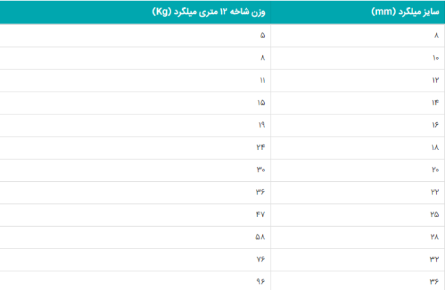 سایز میلگرد (mm) وزن شاخه 12 متری میلگرد (Kg)