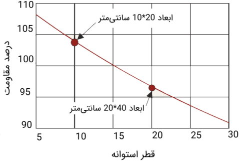 در شکل زیر می توان مشاهده کرد که با ثابت بودن نسب طول به قطر (نسبت 2)، مقاومت نمونه های استوانه ای با افزایش قطر کاهش می یابد.