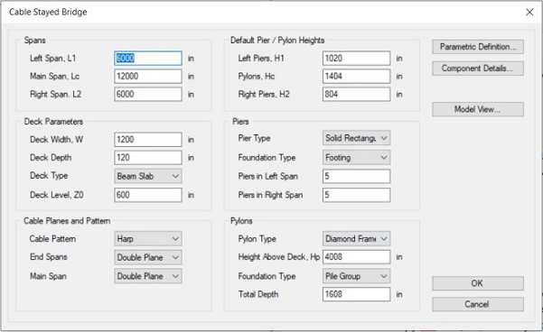 کاربر می تواند مشخصات هر یک اجزای این پل کابلی را به صورت دلخواه تغییر دهد. با کلیک بر روی گزینه OK، مدل پل کابلی به صورت یکجا ایجاد خواهد شد.
