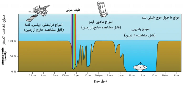 همان طور که در شکل فوق مشاهده می کنید، تنها امواجی که به طور کامل از جو عبور می کنند، امواج رادیویی و تا حدودی امواج مایکروویو هستند.