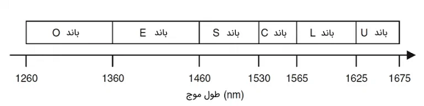 شکل (1) باندهای طول موجی مخابرات فیبر نوری را نشان می دهد. محدوده طول موجی باند های مخابرات نوری در ناحیه مادون قرمز است.