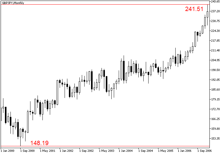 مثال چارت نشانگر یک روند رشد بلند مدت قیمت GBP/JPY از سال 2000 تا 2007 می باشد. که پتانسیل یک پوزیشن خرید "carry trade" بر روی آن بررسی گردیده است. در مدت زمان مورد نظر این مثال، نرخ بهره پوند حدود 5% و نرخ بهره ین نزدیک صفر بوده است. در نتیجه در مورد پوزیشن، نرخ Swap معادل 5% ضربدر میزان لورج می شود. با در نظر گرفتن مدت زمان این پوزیشن و لورج 1:100، میزان Swap معادل 3000% و سود پوزیشن حداقل 9300 پیپ خواهد بود. که باعث حفظ پتانسیل سود دهی این معامله می گردد. تنها مشکل این معامله این است که این روند در سال 2007 به سرعت پایان یافت و معامله گران فرصت خیلی کمی جهت بستن پوزیشن های خود داشتند.